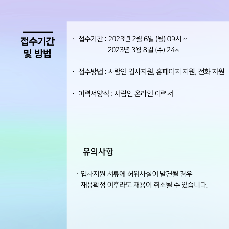 접수방법은 사람인 지원, 홈페이지 지원, 전화지원이 가능합니다.